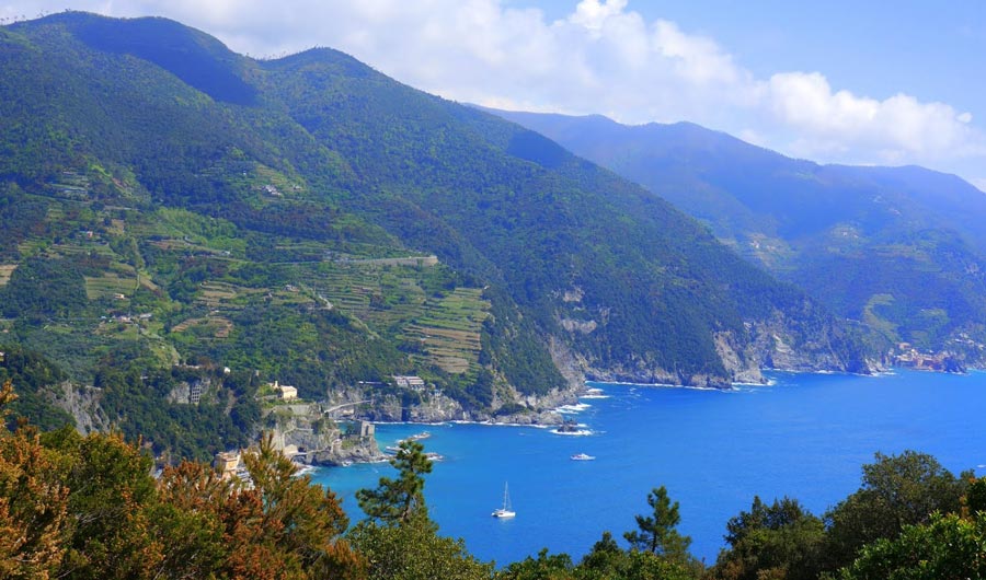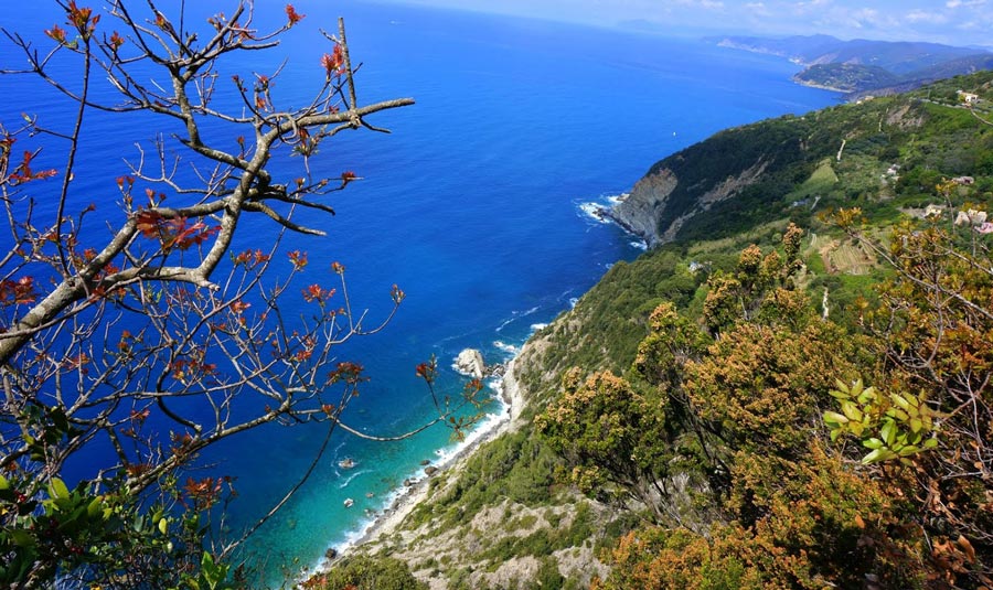 I cinque paesini che formano il territorio delle Cinque Terre, racchiusi dai due promontori di Punta Mesco